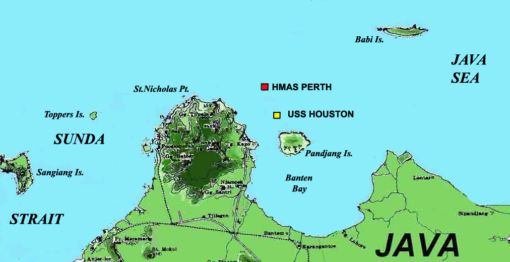 Allied intelligence had reported the Strait clear of enemy vessels and the nearest Japanese were reported to be 50 miles northwest and moving away. Unfortunately this report was at least 24hrs old. Another air force reconnaissance report, about Japanese positions at noon on the 28th, was not received by PERTH or HOUSTON **. Our ships sped on, not knowing that the Japanese invasion fleet was already at Java and lay directly across their escape route. A number of Japanese transports were already waiting in the western side of Banten Bay to disembark part of the invasion force.