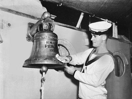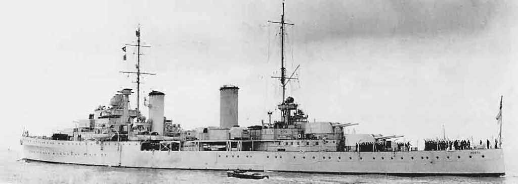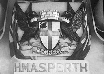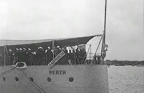 HMAS PERTH commissioned in June 1939 under the command of Capt. H.B.Farncomb MVO. (insert link to naval career) The 10th July was to be the day of the renaming ceremony. The weather was rather windy and AMPHION was moved from her berth at Portsmouth and tied up at the South Railway Jetty at 8am. The morning was spent in readying the ship for the official ceremony and rehearsals. The Coat of Arms of the city of Perth was slung between the barrels of ‘Y’ turret and the name “HMAS PERTH” placed underneath. This was covered by the Union Jack and the name “HMS AMPHION”.