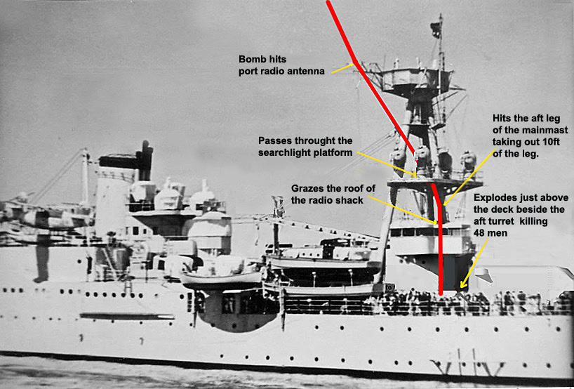 Near midnight on the 3rd February HOUSTON left with the ABDA strike force to search the Makassar Strait for a Japanese Invasion force. They sailed for Meinderts Reef off the north tip of Java and at 0500 on the 4th headed for the Makassar Strait. At about 0930, when about 30 miles south of Kavieng Is. in the Java Sea, the allied ships came under very intense air attack by about 54 Japanese Mitsubishi “Betty” and “Nell” bombers and HOUSTON received a direct hit to her after 8″ turret, killing 48 men and putting the turret out of action. Aircraftsman John Ranger was awarded a Silver Star for heroism in helping to put out the fire in the turret.